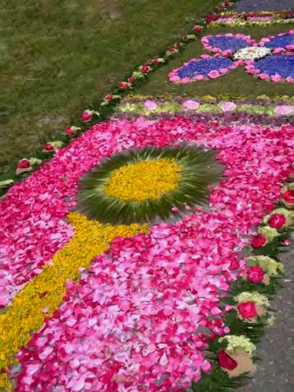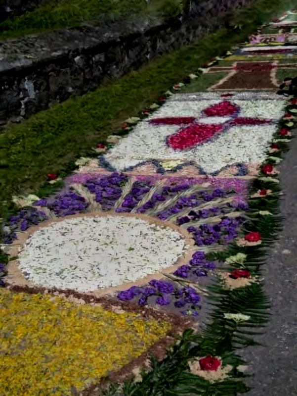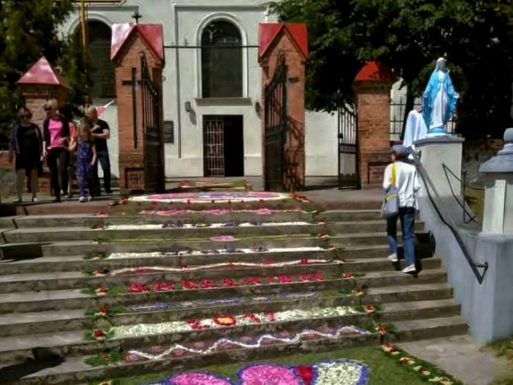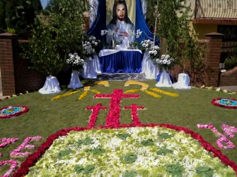 Od 200 lat w dzień Bożego Ciała mieszkańcy wsi od rana gromadzą się, by układać misterny dywan kwiatowy o długości prawie 2 km. Tradycja jest przekazywana z pokolenia na pokolenie. W usypywaniu kompozycji kwiatowych uczestniczą zarówno dzieci, jak dorośli. Początkowo do dekoracji używano wyłącznie żółtego piasku i gałęzi drzew. Kwiaty jako element dekoracyjny zostały wprowadzone w latach 20. XX wieku. Wśród układanych motywów na dywanach z kwiatów dominują symbole i obrazy religijne, rozety i inne kompozycje kwiatowe. Tworzywem artystycznym – oprócz różnobarwnych kwiatów – są liście, gałązki krzewów, kłosy zbóż i kora drzew. Na zakończenie dnia, po mszy świętej po dywanie kwiatowym przechodzi procesja.